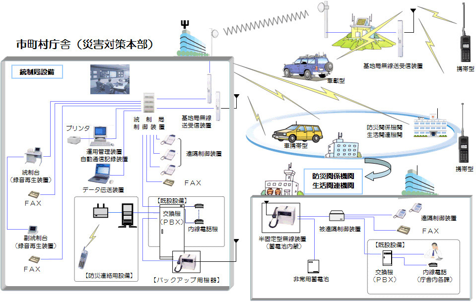 車載型や携帯型の移動局と市町村役場との間で通信を行うもので、同報系が市町村役場(行政機関)と住民との通信手段であるのに対して、移動系は主として行政機関内の通信手段になります。災害などの発生時に、一般電話回線がつながらない場合や携帯電話が通信規制等で通話できない場合でも自治体と消防・警察などの「防災関係機関」、避難所・病院・電力・鉄道などの「生活関係機関」を結び、相互に情報の収集・連絡ができます。平常時には一般行政事務における業務連絡等に活用でき、業務効率化や住民サービスの向上を図ることが可能です。また、通信システムに制約がありますが、同報的運用も可能です。