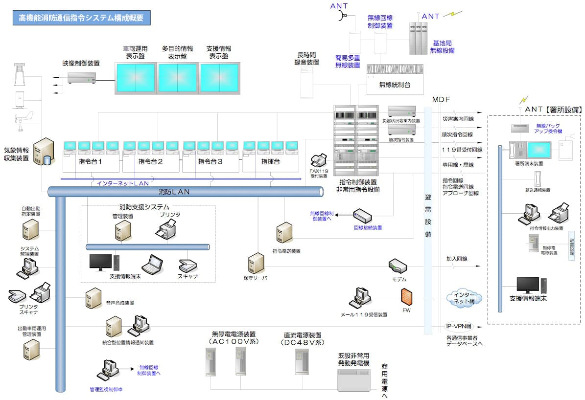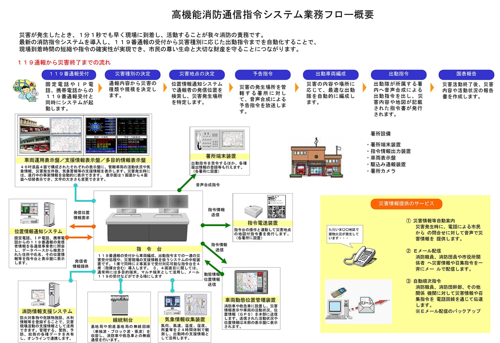 高機能消防指令システムは、消防本部の中枢機構部門の役割を果たすものであり、火災・救助・救急等をはじめとする各種消防業務における通信連絡体制を迅速に処理して消防活動の効果的運用を図り、被害を最小限にとどめることにより、市民の生命・財産を保護し福祉の増進に寄与することを目的として設置するものです。119番通報の受付、火災・救助・救急等の出動指令・車両運用管理、病院連絡等の救急業務の合理的運用、各種消防業務に関する情報処理、消防車・救急車等との消防救急デジタル無線等を一括して、円滑かつ能率的に行い得る機能をもつシステムです。
