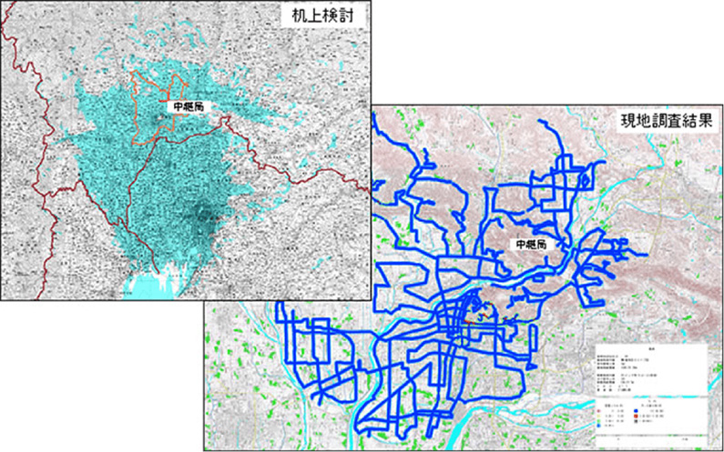 事前の机上検討により想定される電波到達エリアであっても、何らかの条件により通話ができない場合があります。弊社では、机上検討結果を確認するため、実際に使用する無線機と同じSCPC方式の実験機材を多数保有しており、電波伝搬調査により電波の到達エリア確認を行います。